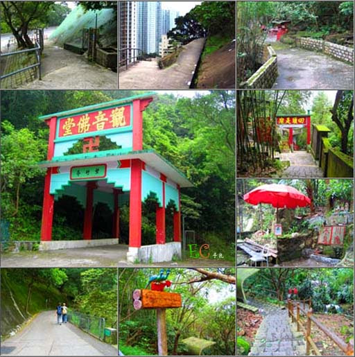 從慈雲山道的法藏寺起步,轉入左方的沙田坳道(右方的山徑是經獅尾上獅子頭,行山初哥切勿嘗試!),沿路是頗斜的石屎車路(小心車輛上落!),上行不久便可在右方見到觀音佛堂,沿路還可見到不小晨運人士留下的塗鴉詩句(如:「酒色財氣四堵牆,人人俱在裡邊藏,有人跳出牆以外,便是長生不老方」、「慈沙露水間,幽徑翠迴環,日日行晨運,南山壽可攀」),越過觀音佛堂後山的待客亭後,便可步上火紅色的「半島獅子園」,其上設有休憩亭,更開有士多給行山人士補給糧水! |